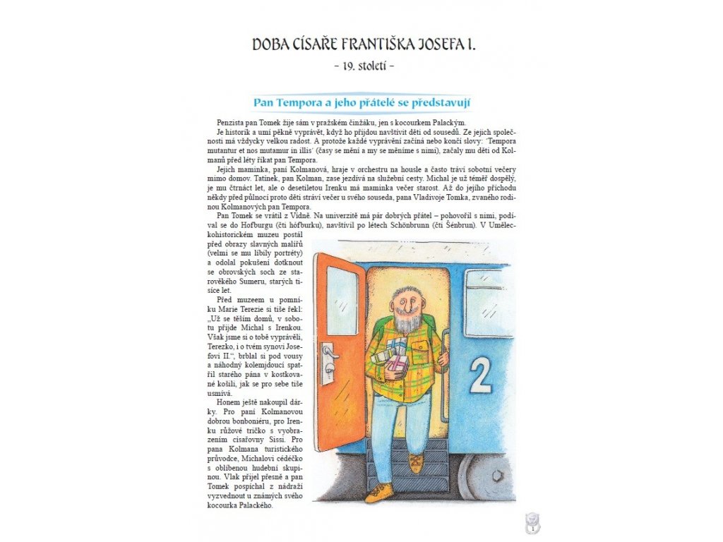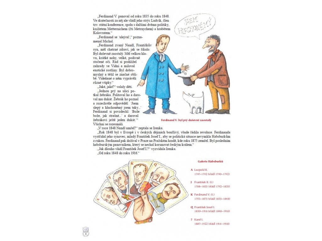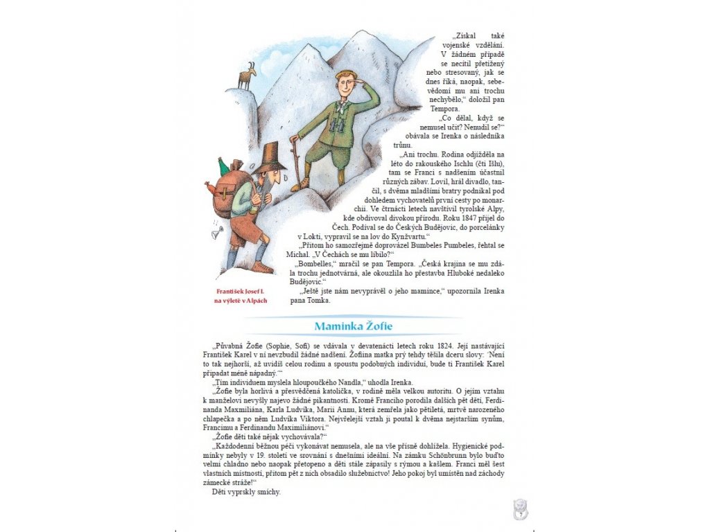 Formou vyprávění historika na penzi dvěma dětem od sousedů se dozvíte mezi historickými fakty o Františku Josefovi i klípky z jeho života, života rodinných příslušníků i dobových postav. V řadě deseti sešitů jsou zpracovány jednotlivé etapy českých dějin netradiční formou téměř detektivního vyprávění historika dvěma dětem různého věku. Jejich všetečné otázky umožňují konfrontovat současné smýšlení mládeže s historickými fakty, srovnávat současnost s minulostí v různých aspektech lidské činnosti (bydlení, oblékání, stravování, diplomacie atd.). Každý ze sešitů přibližuje jedno období českých dějin na konkrétní osobě panovníka, který je vylíčen se všemi lidskými vlastnostmi, příbuzenskými vztahy i kladnými a zápornými činy. Kapitoly jsou obohaceny barevnými a často humornými ilustracemi, které však vždy vycházejí z historických předloh.