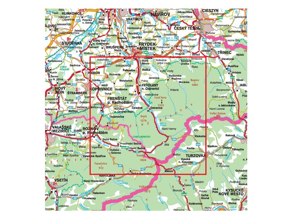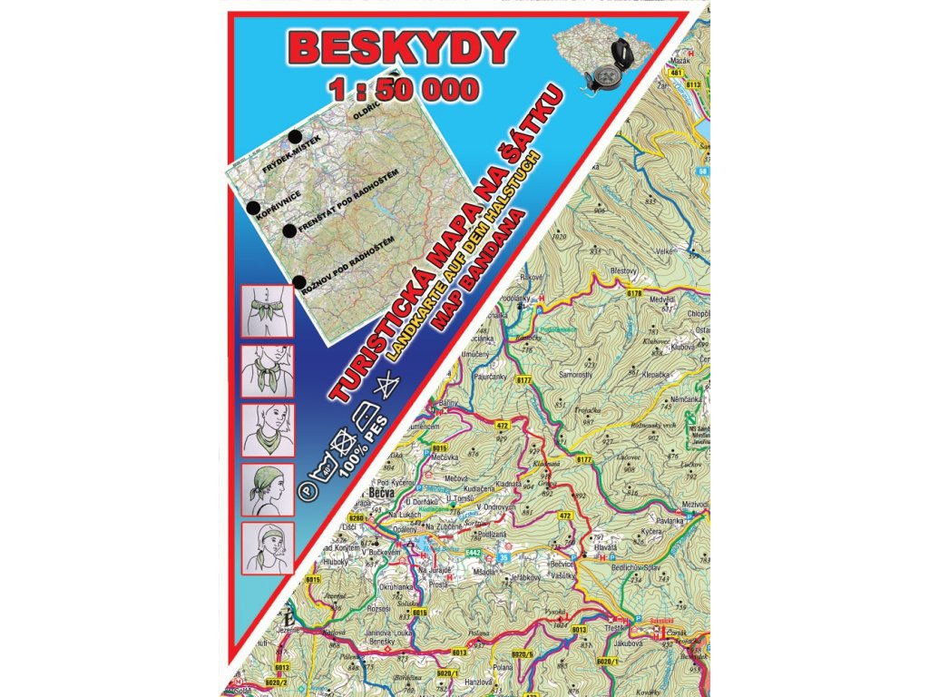 Unikátní mapa na našem trhu, kterou máte při výletech stále u sebe, ať už v batohu, kapse, na zápěstí, či jako čelenku na hlavě. Je odolná rozmarům počasí, a i když ji ušpiníte, snadno ji vyperete a můžete dále používat. Ideální společník pro turisty, cykloturisty, vodáky a všechny ostatní, kdo se vydávají do přírody. Kromě orientace v přírodě, šátek samozřejmě můžete využít mnoha jinými způsoby, jako čelenku, obvaz, kapesník... Mapa Beskyd 1 : 50 000 pokrývá hlavní beskydský hřeben od Radhoště na západě až po Javorový na severovýchodě.