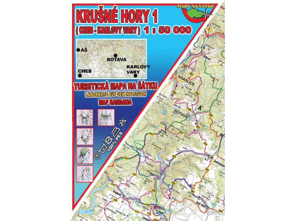 Unikátní mapa na našem trhu, kterou máte při výletech stále u sebe, ať už v batohu, kapse, na zápěstí, či jako čelenku na hlavě. Je odolná rozmarům počasí, a i když ji ušpiníte, snadno ji vyperete a můžete dále používat. Ideální společník pro turisty, cykloturisty, vodáky a všechny ostatní, kdo se vydávají do přírody. Kromě orientace v přírodě, šátek samozřejmě můžete využít mnoha jinými způsoby, jako čelenku, obvaz, kapesník... Mapa Krušné hory 1 (Cheb – Karlovy Vary) pokrývá zhruba území mezi Chebem, Aší, Karlovými Vary a státní hranicí Česka (více viz rozsah území). šátek z polyesterového hedvábí mapa/šátek velikosti 96 x 55 cm legenda v češtině, angličtině a němčině prací symboly Ještě více informací na www.mapynasatku.cz.